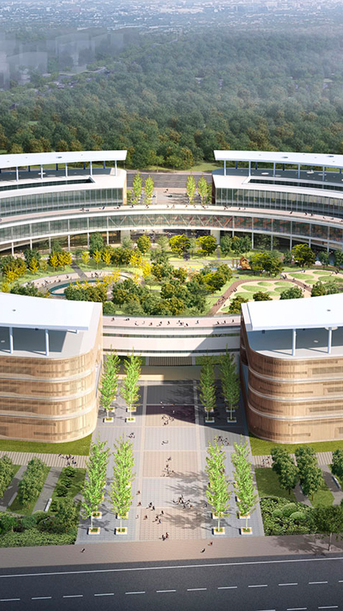 项目独特的建筑形态:椭圆型的基本构图源自对场地现状及周边环境的充分解读。各个场馆置于基地的四个转角,共同围合出中央的城市公园。二层立体环廊及连续的屋顶飘板,使整个项目呈现出致简、致美的现代感。在这里,任取一个起点,都能享受到文化与自然的碰撞,带来视觉与感官的立体体验。